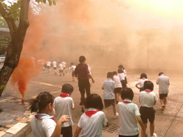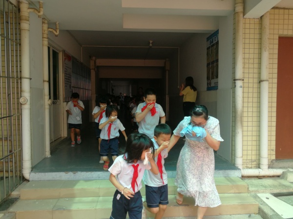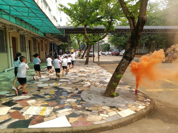 午休結束后,隨著警報響起,學生迅速按照老師的指示,用衣服或者濕毛巾輕捂口鼻,扶墻彎腰前進,在不到5分鐘的時間內,各班的學生都安全地從生活區撤離到預設的安全集合點。此次演練為保障師生安全,安全處在各通道重要位置均安排有老師指揮,確保學生是從安全逃生路線有序地撤離。來到安全集合點,各班班干部配合班主任迅速清點本班人數并排隊報告給領導部門,確保不遺漏任何一個人。