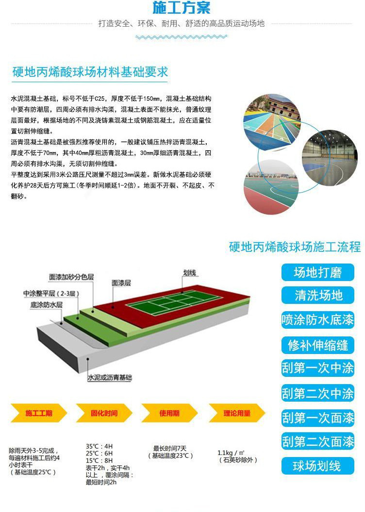 適用范圍:網球場、籃球場、羽毛球場、排球場、室內外地坪,走廊樓梯,景觀道路,游樂場地面。