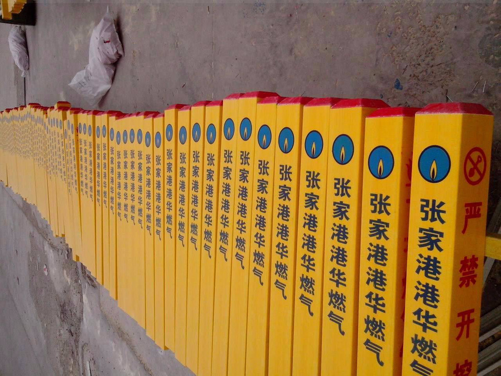 玻璃鋼(PVC)標志樁安裝底部設有兩對穿孔,0.5直徑小斷鋼筋呈十字交叉,灌少量水泥固定;安裝步驟:1.挖30-50cm深度30-60cm方洞2.將兩段鋼筋插入標志樁下方對稱插孔中呈對稱十字交叉3.放入標志樁;燃氣管道警示牌的用途玻璃鋼標志牌常用于高風險地區管道安全防范事項的地面警示標志,例如隧道、大型河流、山谷、沖溝、村莊等。用于標記埋地管道的轉向、管道與地面工程(地下隱蔽物)交叉、管理單位交界、管道結構變化(管徑、壁厚、防護層)、管道附屬設施的地面標記。常見為鬧市、風景區、綠化帶、灌木叢、頂管兩側管線路徑指示作用。輸油管道標示牌又叫輸氣管道標示牌、電力電纜標示牌、礦區指示標示牌、交通警示標示牌、戶外指示牌等。燃氣管道標志牌(管道s環)三要素1、識別s,2、介質名稱,3、流向所有管道標識都必須注明識別s、介質名稱和流向,這j是管道標識的基本三要素。有些管道還須注明壓力、流速、溫度等,危險化學品管道需要用專用危化品s環,消防管道還要注明消防專用等。