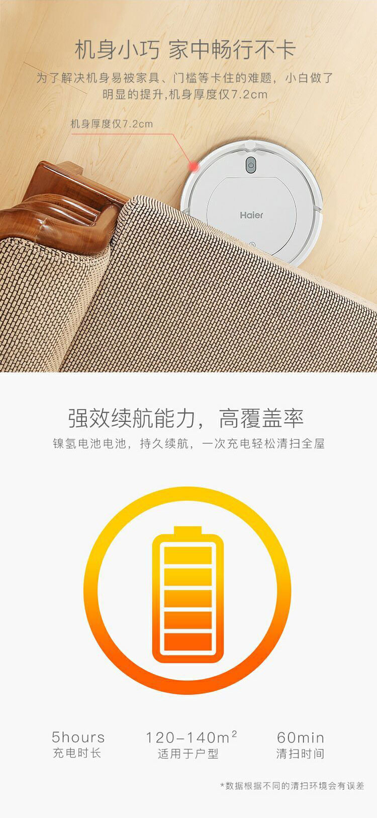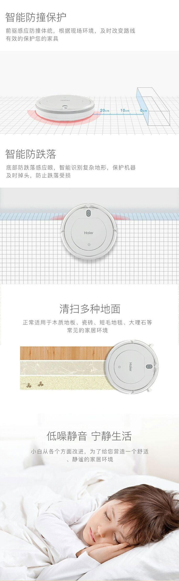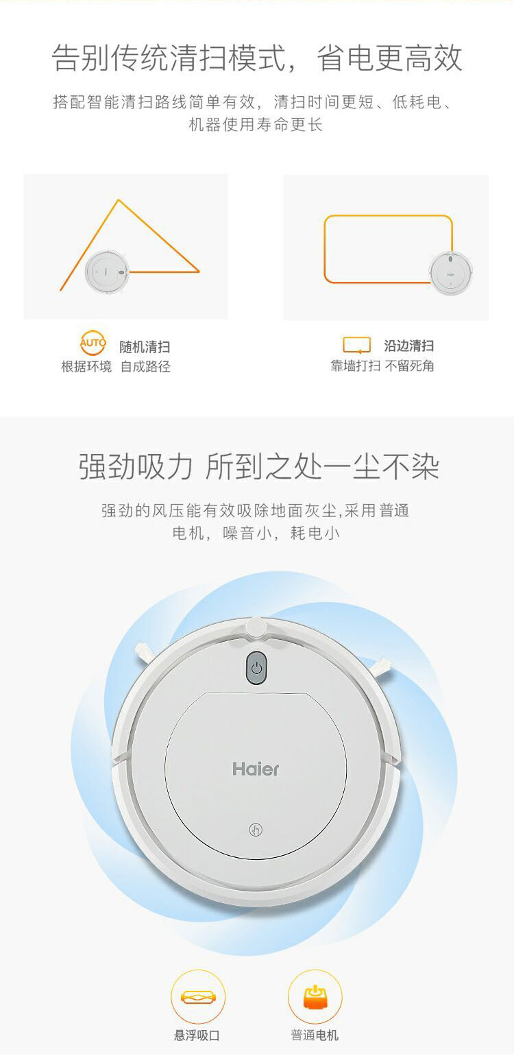 這款機器噪音非常的小,享受寧靜干凈的生活。能根據環境自成路徑,靠墻打掃,沒有死角可言。底部還有防跌落的感應眼睛,智能識別復雜的地形,保護機器及時調頭,防止跌落受損。前驅感應防撞體統,根據現場的環境能夠及時的改變路線,有效地保護您的家具和機器本身。機身厚度僅7.2cm,解決了機身被門檻、家具卡住的問題,適用于木質地板、瓷磚、短毛地毯、大理石等等常見的家居環境。海爾專注研發家電多年,值得信賴。