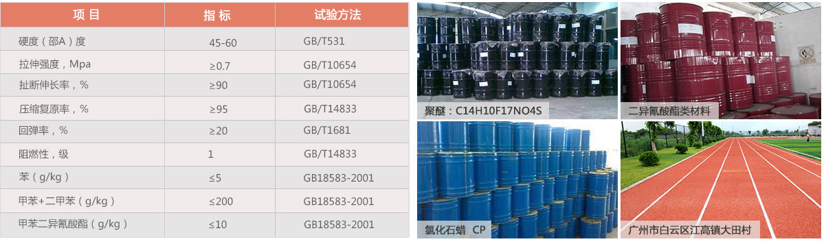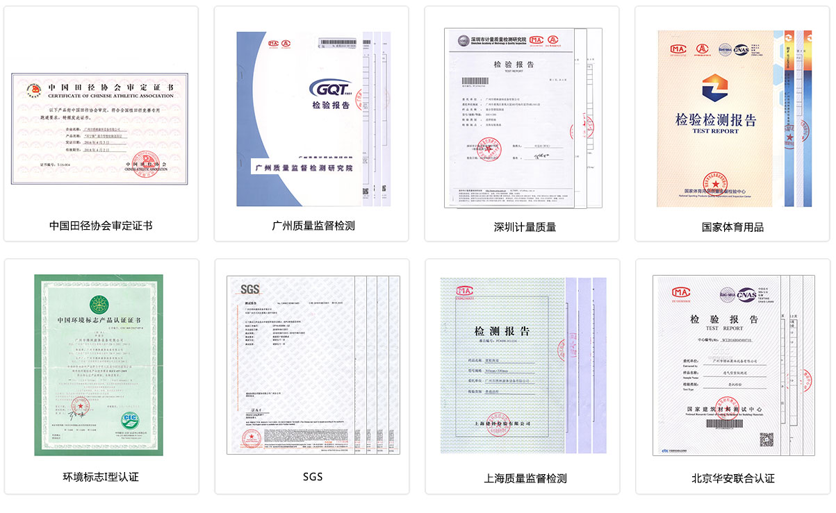 塑膠跑道獲得:中國田徑協會審定證書、廣州質量監督檢測、深圳計量質量、國家體育用品、環境標志I型認證、SGS、上海質量監督檢測、北京華安聯合認證等。