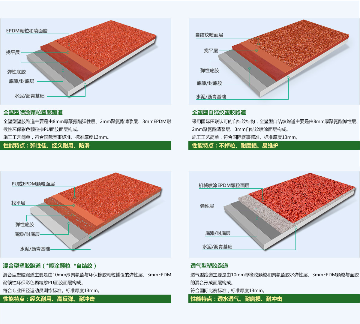 全塑型塑膠跑道、自結紋塑膠跑道、混合型塑膠跑道、透氣型塑膠跑道等。
