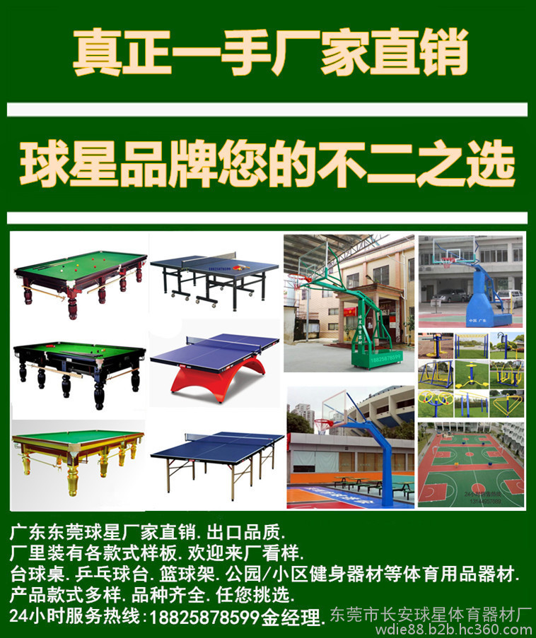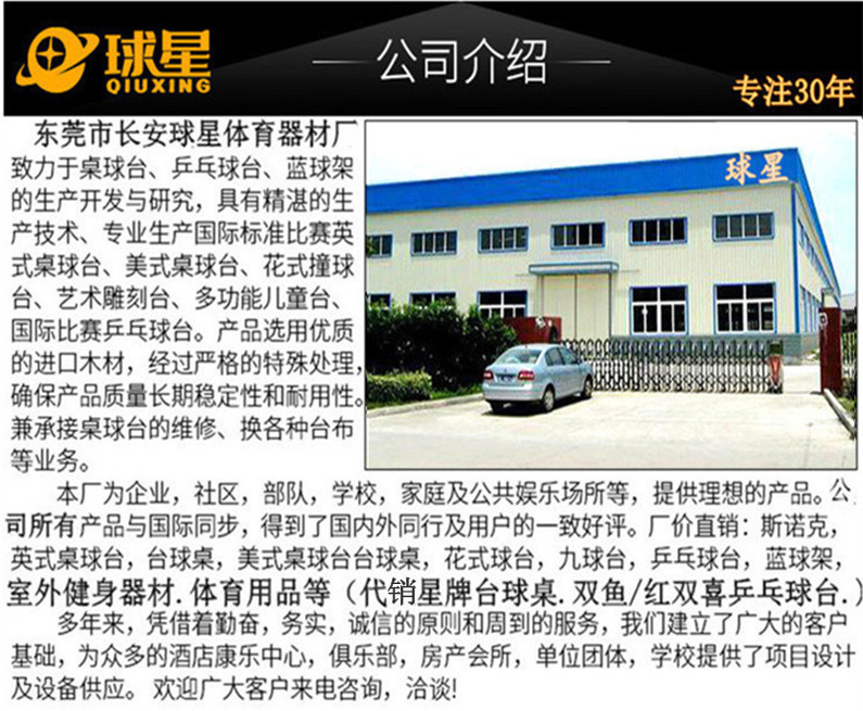 東莞市長安球星體育器材廠集三十多年管理、制造經驗,專業制造桌球臺、乒乓球臺、籃球架、桌上足球.公園.小區健身器材等./等體育用品。秉著質量至上,信譽好的原則,所做產品深受客戶好評。桌球臺、乒乓球臺、籃球架.桌上足球.公園小區健身器材五個系列產品遠銷歐洲,南、北美洲,澳大利亞及部分阿拉伯**。