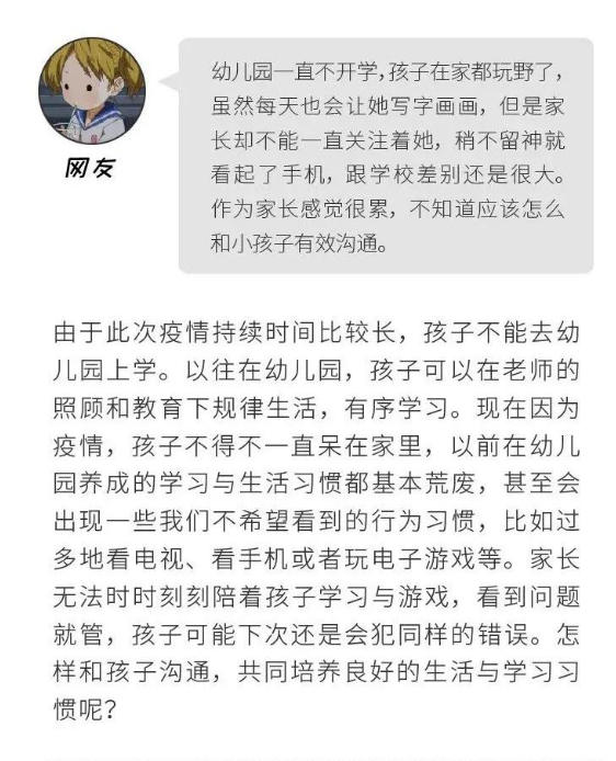教育部說,疫情期間,學齡前兒童面臨生活學習習慣改變,過多看電視、手機或玩電子游戲等問題。家長應該怎樣和孩子溝通?如何共同培養良好生活與學習習慣?心理專家給出了“合理居家作息時間安排”“與孩子共同制定居家活動計劃”等5方面有針對性的建議。