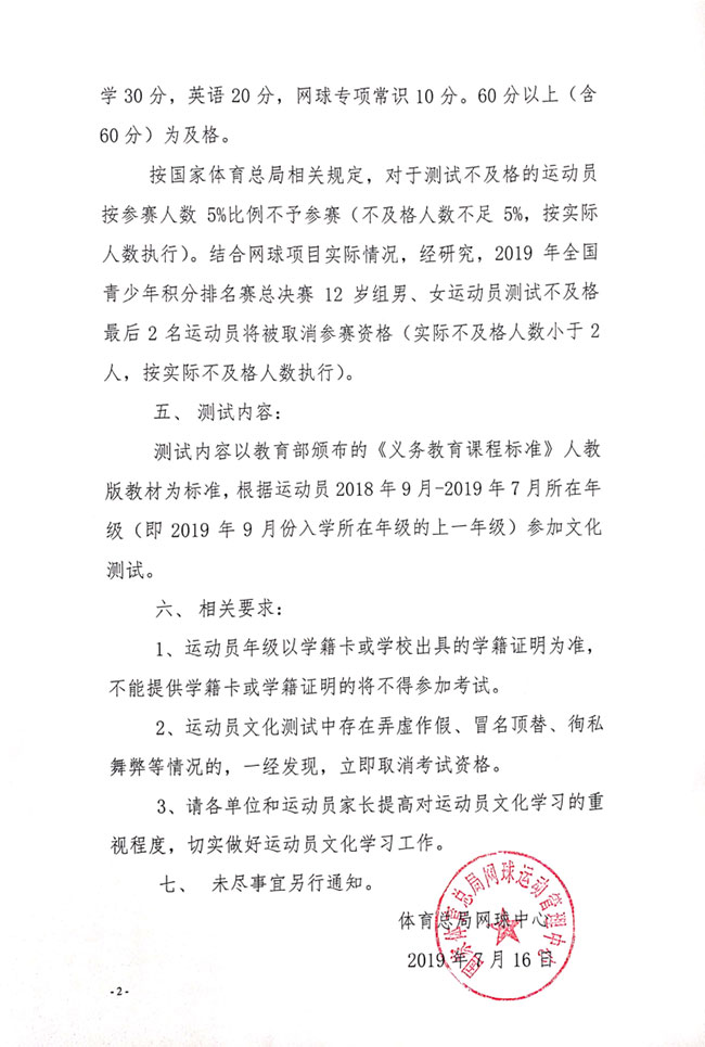 關于開展賽前運動員文化測試工作的通知 2019-07-16 09:47:00 中國網球協會
