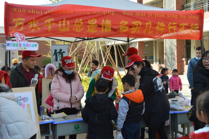隊員們準備的物品品種多樣、物美價廉,有各種美味小吃,有閑置的毛絨玩具、文具、書籍、手工藝品,還有全新的水杯、玩偶、滑板車等,琳瑯滿目的商品把班級小鋪擺放得滿滿當當。吆喝聲、叫賣聲、歡笑聲不絕于耳,現場氣氛熱鬧,秩序井然。為了吸引更多的顧客光顧,各班的小售貨員們使出了渾身解數,有的一邊揮舞著自制的宣傳牌,一邊大聲吆喝;有的打出“買就送”的標語,吸引了大批顧客。不僅小售貨員們忙得不亦樂乎,顧客們也是忙得不可開交,他們看看這個攤位,逛逛那個攤位,興高采烈地砍著價格,買到自己的心儀物品后,個個臉上洋溢著歡笑。