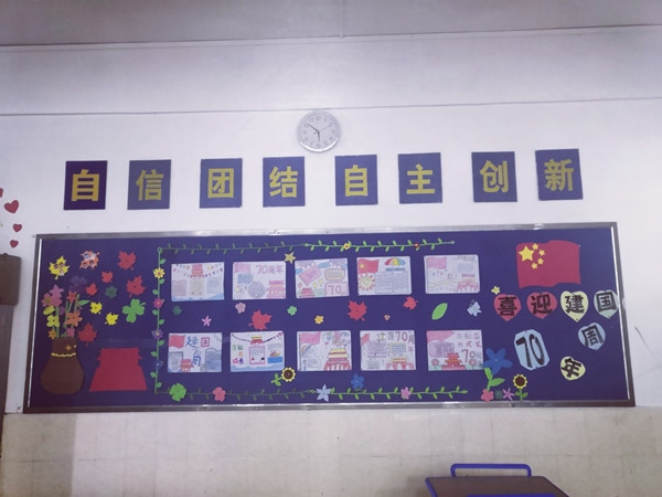 一進校園,一派喜慶。學(xué)校張燈結(jié)彩,掛滿了紅燈籠和小紅旗,在楊仙逸銅像旁邊還立著一塊大大的展板寫著祖國母親70年的輝煌歷史。在德育處和美術(shù)老師的安排下,學(xué)校還舉行了“喜迎70華誕,向祖國致敬”的主題繪畫和手抄報比賽。學(xué)校小禮堂的板報布置別具風(fēng)格:有同學(xué)們的書法作品、繪畫和手抄報作品。無論是一二三年級的繪畫還是四五六年級的手抄報,每一副作品都表達了孩子們對祖國母親的熱愛之情。