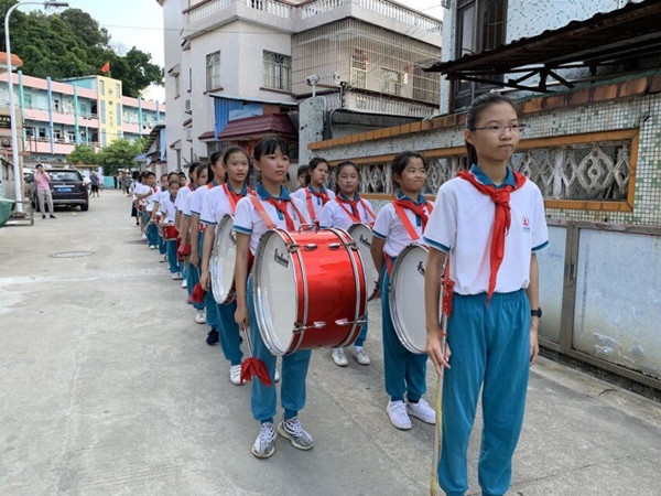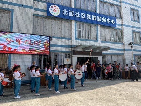 為提高少先隊員熱愛祖國,熱愛人民軍隊的意識,進一步弘揚和培育學生的民族精神,從小樹立 “保衛祖國,人人有責”的觀念,2019年9月10日上午,北臺小學鼓號隊全體隊員身著整齊的服裝,在少先隊輔導員莫冰老師的帶領下,精神抖擻地參加了北溪社區的送軍活動。