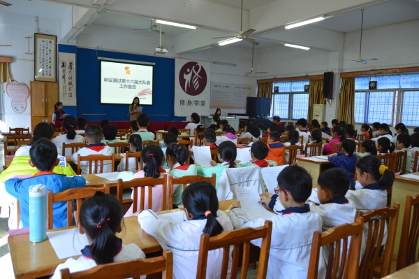 伴隨著莊嚴(yán)的出旗儀式和嘹亮的隊(duì)歌,大會拉開了序幕。會上,審議通過少工委第二屆一次全委會選舉辦法、第二屆少工委主任、常務(wù)副主任、副主任候選人名單,并選舉產(chǎn)生了竹秀園中心小學(xué)第二屆少工委主任、常務(wù)副主任。學(xué)校少工委副主任羅少光校長向大會致閉幕詞。他充分肯定了學(xué)校少先隊(duì)工作取得的各項(xiàng)成績,希望隊(duì)員們樹立遠(yuǎn)大理想,不懈努力,做祖國優(yōu)秀的接班人,整個過程中,代表們認(rèn)真聆聽,積極參與。