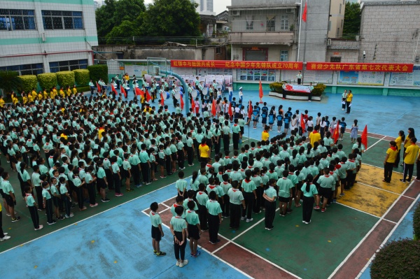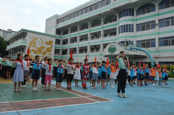 此次活動分東西兩個(gè)校區(qū)分別進(jìn)行,西校區(qū)學(xué)生按升旗儀式排好隊(duì),一年級的預(yù)備隊(duì)員準(zhǔn)備入隊(duì),東校區(qū)各班主任帶領(lǐng)全體少先隊(duì)員面向中隊(duì)旗做到“四個(gè)一”:少先隊(duì)員敬一個(gè)隊(duì)禮、唱一次隊(duì)歌、重溫一次誓詞、莊嚴(yán)呼號一次。