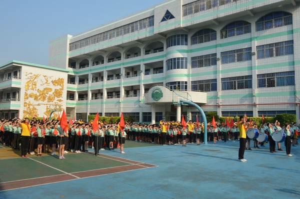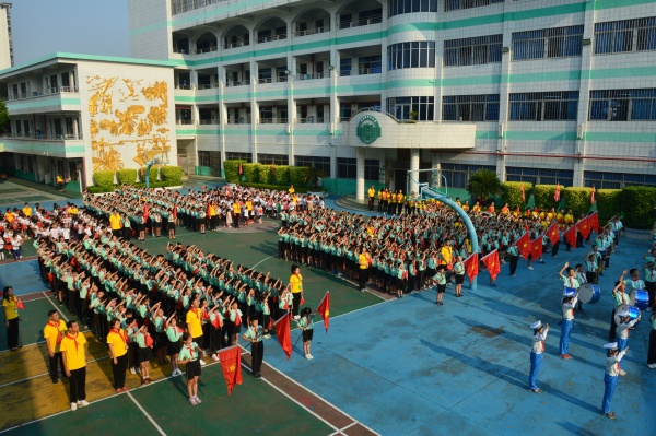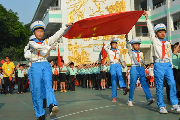 伴隨著激昂的出旗曲,護(hù)旗隊(duì)隊(duì)員邁著整齊矯健的步伐,護(hù)送國(guó)旗走上升旗臺(tái)。伴隨著莊嚴(yán)的國(guó)歌聲,鮮艷的五星紅旗冉冉升起,在全體師生的注目與齊唱國(guó)歌聲中迎風(fēng)飄揚(yáng)!