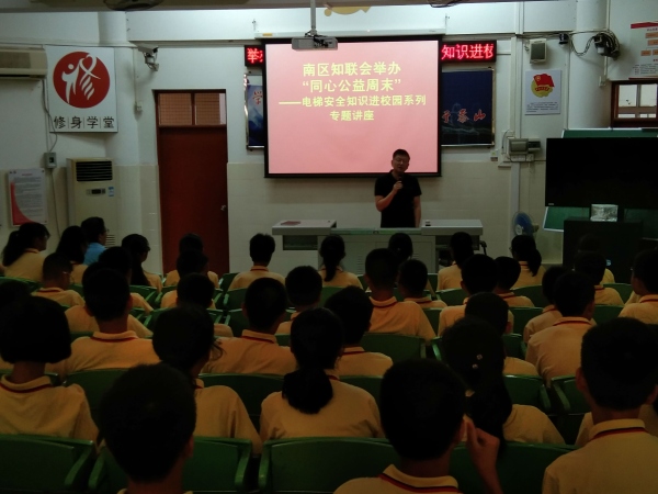 為提高學生的安全意識和自我防護意識,營造安全和諧的校園環境,近日,中山市良都中學邀請南區知聯會一同舉辦“同心公益周末”電梯安全知識進校園系列專題講座。