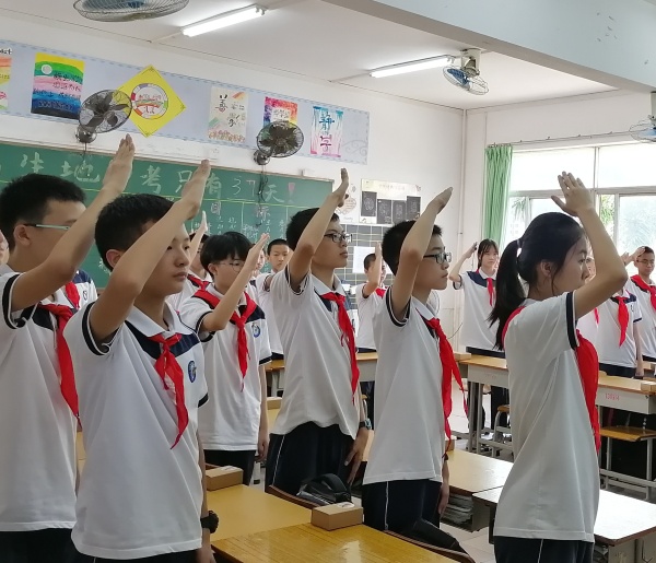 學校少工委總輔導員李勉霞老師給離隊隊員寄語:“今天,標志著你們兒童時代的結束,這是成長道路上的一個里程碑,是邁向青春的第一步,在此,我向初二級全體離隊隊員表示祝賀!”其次,由學校少工委主任盧新泉校長給離隊隊員致辭:“十四歲,這個陽光燦爛的季節,是最有魄力的花季,青春一旦經過努力,經過奮斗,便會更加燦爛、輝煌。作為新時代的中學生,祖國、人民、老師、家長都對你們寄予厚望,期盼著你們成為祖國的棟梁之才,成為優秀的接班人。而后,由學校少先隊大隊輔導員沈瑤老師帶領離隊隊員呼號:“準備著:為共產主義事業而奮斗”“時刻準備著”,鏗鏘有力的呼號聲在校園回蕩。