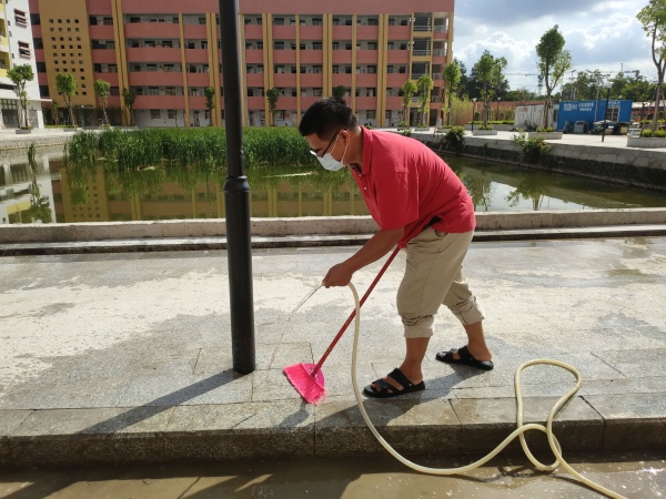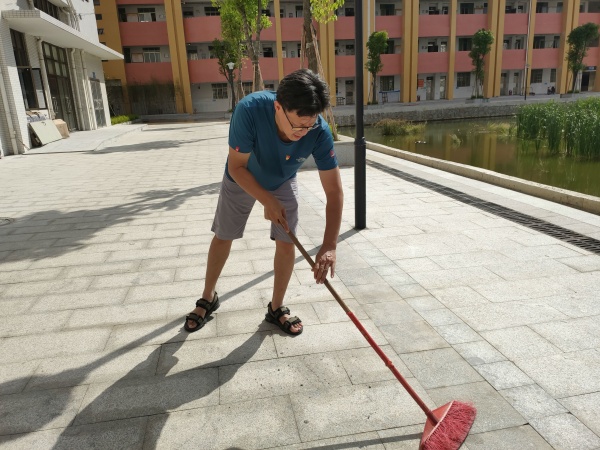 行動中,烈日當空,炙烤著大地,教師們面對校園景觀改造工地地面塵土堆積,碎石隨處可見,生活垃圾隱匿角落的景象沒有就此退縮,反而熱情高漲,手拿大掃帚,扛著大鐵鏟,推著斗車,興致勃勃地投入到清潔行動中。為了把塵土堆積的地面進行徹底地清潔,有的教師拿著水管來沖刷,有的教師拿著拖把來清理;為了把隱匿在空調主機背后的生活垃圾,盧新泉校長用未戴手套的雙手清理垃圾,在盧校長的率先垂范下,幾位初一級老師紛紛用手把垃圾清理干凈,充分發揮了不怕累、不怕臟的精神;他們如此認真地清潔,如此勤懇地付出,是因為把學校當做家呀!即便是揮汗如雨,依舊義無反顧,教師們的行動保證了校園各個角落干凈整潔。