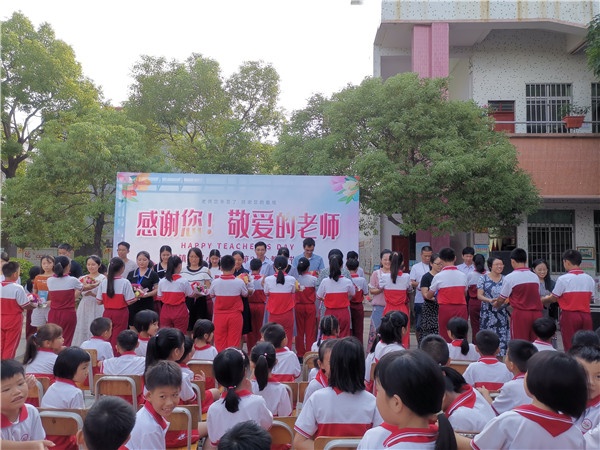 隨后由學(xué)生表演節(jié)目,分別由五(1)班和五(2)班的學(xué)生代表上臺(tái)進(jìn)行詩(shī)歌朗誦——《老師,您是蠟燭》和《謝謝您,我最親愛(ài)的老師》,聲音飽含情感,抑揚(yáng)頓挫,字字句句無(wú)不表達(dá)了對(duì)老師的敬意和感激之情。接著,由李文惠、羅詩(shī)韻同學(xué)為老師們獻(xiàn)上了歌曲《老師》,歌聲嘹亮而動(dòng)人。《每當(dāng)我走過(guò)老師的窗前》,由李文惠、羅詩(shī)韻、岑詠詩(shī)和黃錦君演唱的歌曲一度將活動(dòng)推向了高潮,全體師生參與到合唱中。
