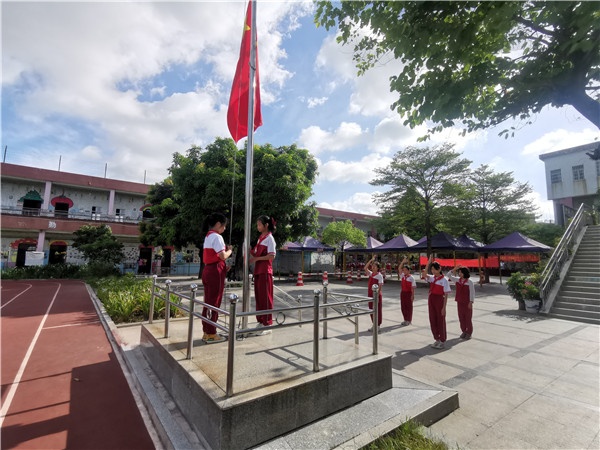 全體師生莊嚴肅穆面向國旗,國歌聲響徹校園,一只只舉起的小手,都是對祖國一份份的敬意,身為新時代的祖國花朵,應努力學習,奮發向上,為建設祖國出一份力。