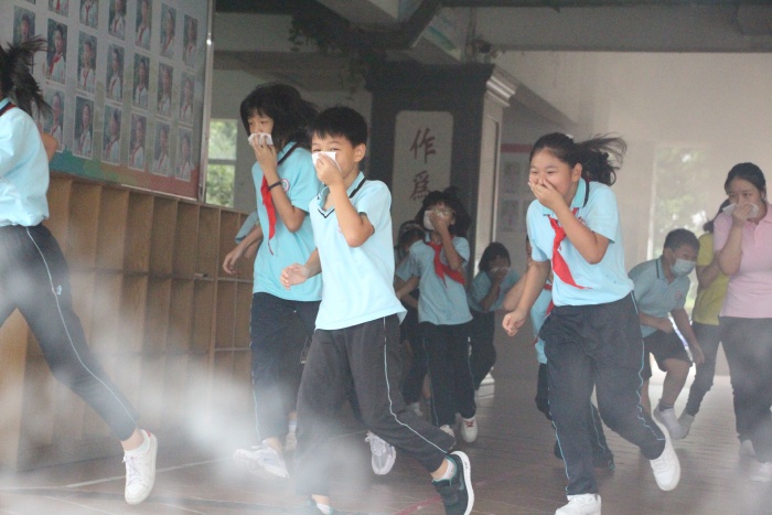 8時50分,各樓層突然濃煙四起,警報聲響徹校園,各位老師按照預案的要求各就各位,所有學生在老師的組織下,迅速把毛巾或紙巾打濕,按照平時指定的路線彎腰前進,有序疏散到了安全的地點。