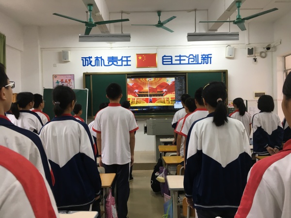 首先,舉行莊嚴的升旗儀式,全校師生奏唱國歌,集體背誦二十四字社會主義核心價值觀和學校校訓。接著進行主題教育,首先讓學生認識生命不僅屬于自己,也屬于家庭。父母含辛茹苦地孕育我們,我們承載著家庭、父母的希望,我們一出生,家人就開始為我們付出辛勤的勞動。所以,我們更應該珍惜自己的生命!接著圍繞“何謂校園欺凌?”、 “校園欺凌的特點 ”、“校園欺凌的危害”、“如何應對欺凌?”展開學習,并學習了《廣東省最新的校園欺凌處分條例》 ,讓學生認識了校園欺凌的種類和事件的處置。并列舉了全國各地近期以來發生的大量鮮活案例,深入淺出地分析了校園欺凌事件產生的原因及危害后果。并結合個別同學身上出現的不良行為進行剖析,從而告誡學生,對校園欺凌事件要采取零容忍的態度,不但自身不能觸犯欺凌行為,還要懂得保護自己,采取正當方式和欺凌行為作斗爭。
