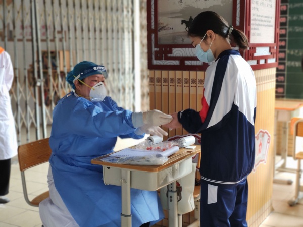 本次核酸檢測委托第三方檢測機構完成,需要檢測的學生共有一千多人,分三個批次進行,分別是走讀生、住宿生,外鎮就讀畢業生。