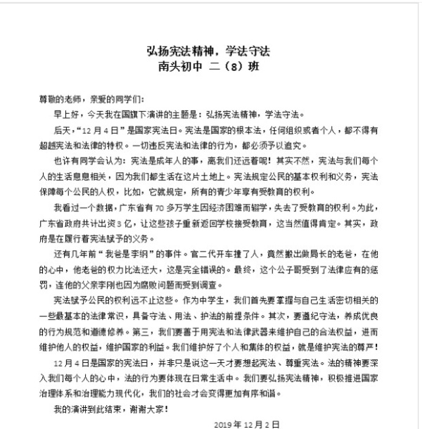 為貫徹教育部《關(guān)于開展2019年教育系統(tǒng)“憲法宣傳周"系列活動的通知》,推動廣大師生集中深入學(xué)習(xí)宣傳憲法,弘揚(yáng)憲法精神,維護(hù)憲法權(quán)威,南頭鎮(zhèn)初級中學(xué)開展為期7天的“憲法知識進(jìn)校園”活動。