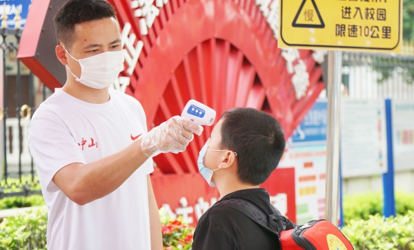 第一天的工作顯得尤其重要,所有班主任早早進入教室,迎接久別的孩子。雖然是錯峰返校,人員不密集,但是大家對安全一刻沒有放松。為了減少學生與外來人員接觸的機會,按照上級統一部署要求,首先要把好進校門第一關。相關老師和工作人員都按照規定提前到崗,履行職責。學生抵達學校后,除學生本人可以進入校園外,學生家長、其他同行人員、車輛均不得進入校園。所有沒有課的老師配合保安人員維持現場秩序,確保每個學生間隔一米排隊等候。學生出示健康碼,佩戴好口罩才能進入校園,保安人員對學生進行了嚴格的體溫檢測,噴灑免洗洗手液,嚴格把好進門關。學生中有帶行李和文具的,將行李和文具放置在設定的消毒區域,由工作人員對其進行消殺后,學生方可攜帶行李進入校園。默契的配合,一切都顯得那么自然而溫馨,疫情無情,校園有愛……