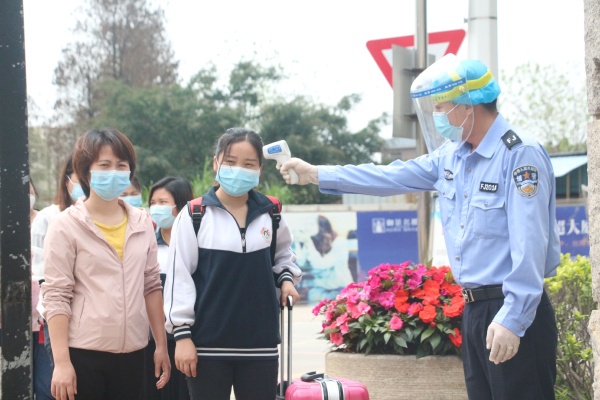 本次模擬演練從學生進校門環節開始,包括對學生體溫進行檢測、手部消毒、鞋底消毒及行李消毒、佩戴口罩、在學校大門口間隔一米距離排隊等等都進行了嚴格的要求。