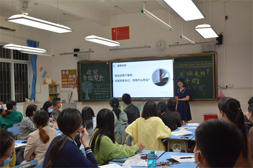 本次活動首先由低年級級長肖清嫻進行主題發言,她結合自己的德育實踐和管理經驗,從主題班會課的定義、班會主題的確立、班會課的策劃以及深化鞏固成果等方面進行了闡述:選題切入點要小,從急切需要解決的問題出發;借助班會課專屬的評價機制提高班會課的有效性……給班主任們帶來新的啟發。