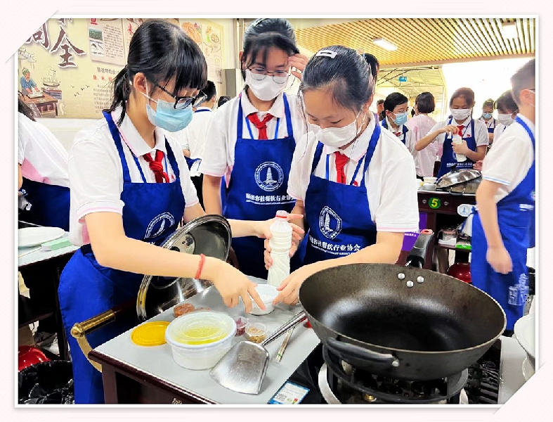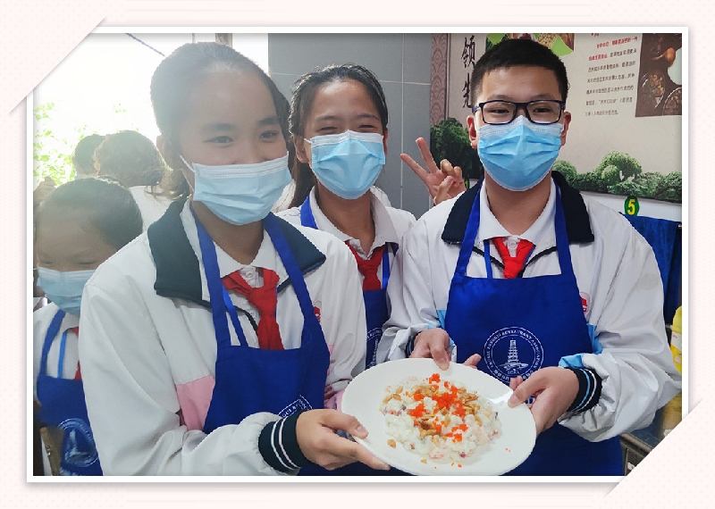 學生實操環節,同學們小試牛刀,四人一組分工合作,調食材的調食材、炒的炒,有條不紊地按孫老師指導的形式進行嘗試烹飪。記者也一邊攝錄一邊對同學們進行采訪,她們對同學們在勞動過程中展示出來的生活能力由衷贊賞。當記者問道同學們最難忘的一節烹飪課是那一節時,同學回答到這樣的課有太多了——荷芹炒臘味、鰻魚炒飯、涼瓜炒牛肉、絲瓜浸魚腐、煎釀三寶-----;同學們自信地告訴記者,自從在紅旗中學學習美食勞動課程后,同學們在家經常煮飯給父母吃,成為名副其實的家庭暖男;對于這節課,同學們開心地告訴記者,既開心又緊張,做這個菜要非常有耐心,擔心失敗,在大家的努力下最后還是成功了,收獲滿滿。