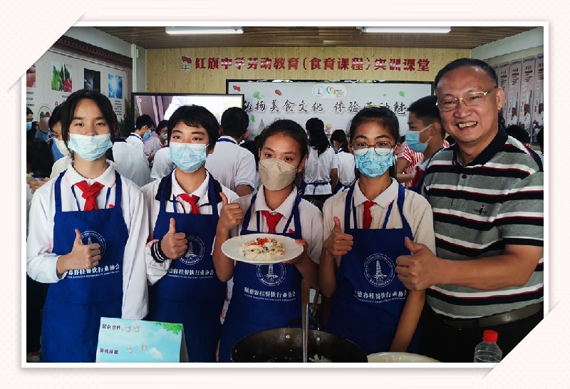 紅旗中學2019年開始構想、實施勞動教育課程,且成效顯著,獲評佛山市中小學勞動教育特色學校,CCTV-10科教頻道《味道》欄目攝制組走進學校勞動教育實訓課堂拍攝,《基于“順德美食文化”的家、校、社區融合勞動教育路徑探索與實踐》課題被立項為省級勞動教育課題……短短三年時間,紅旗中學的美食特色勞動教育已擁有多個亮眼“標簽”。