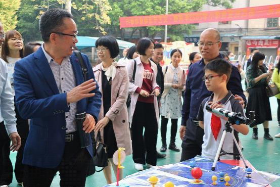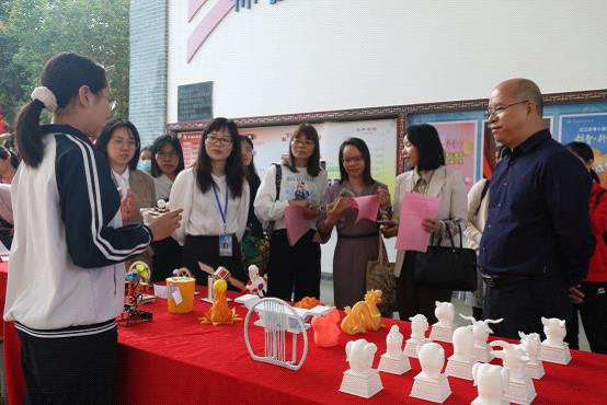 在李少強校長的帶領下,領導和新興的同行們察看了校園環境文化,觀看了學校的創智·科漫節的成果展示,饒有興致地聽了學生關于小小科學家、紙橋承重、蘿卜搭高塔、變廢為寶、3D打印等現場解說,被孩子們的觀察力、學習力、思維力、動手能力和表達能力深深吸引著。