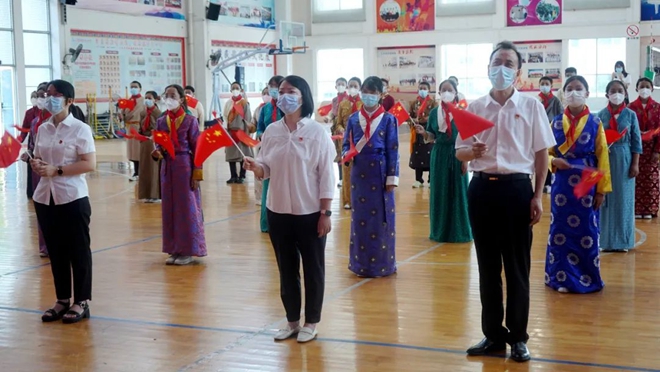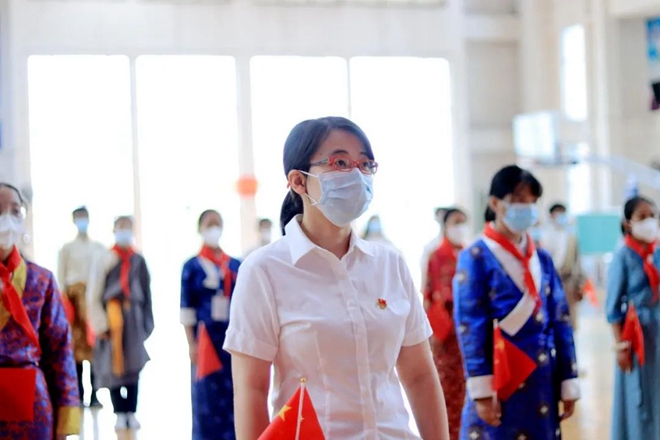 勒流街道黨工委委員江霞,勒流教育辦主任盧綺紅,教育辦黨建人事股股長甘永杰,江義中學黨總支書記、校長胡和秋,副書記周霞,副校長梁凱奇、段永輝、何善斌,以及西藏部主任鄭林莊等教師,與西藏班學生一起參加升旗儀式。因疫情仍然留在西藏等候返校的學生通過網絡直播參加線上升旗儀式。