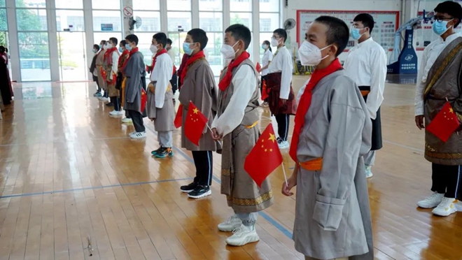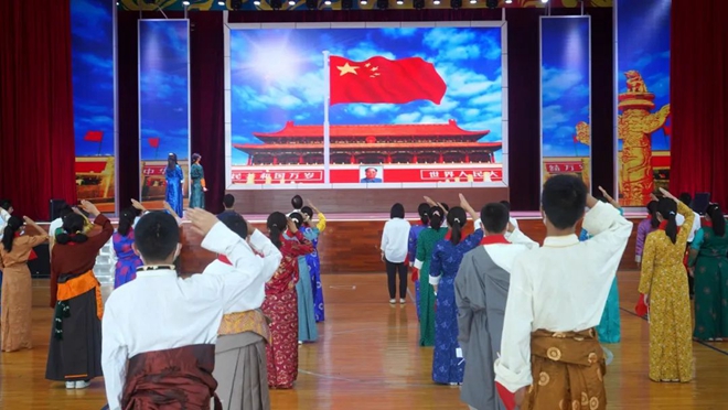 54名西藏班學生身著民族服裝,精神飽滿,伴隨著莊嚴的《義勇軍進行曲》,滿懷敬意地注視著五星紅旗冉冉升起。