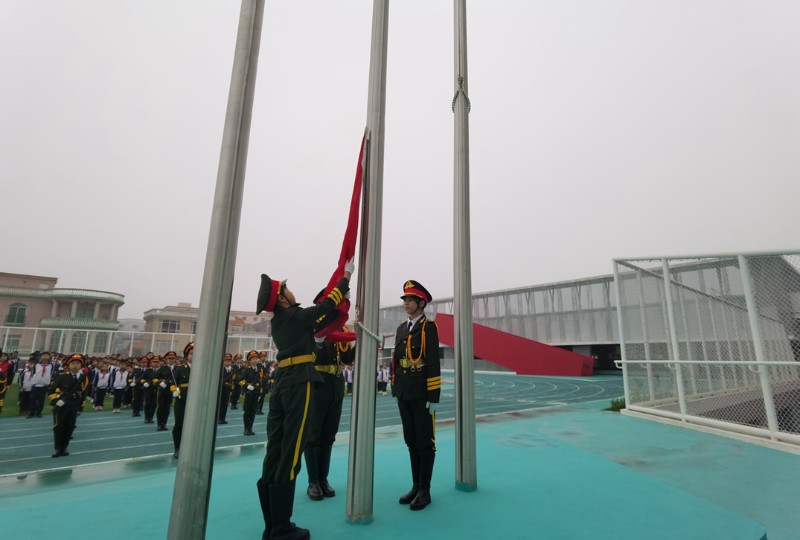 國旗冉冉升起,不忘少年志。“起來!不愿做奴隸的人們.......”全體師生高唱國歌,燃?xì)庑闹心潜K通向夢(mèng)想的燈,不忘中國心。