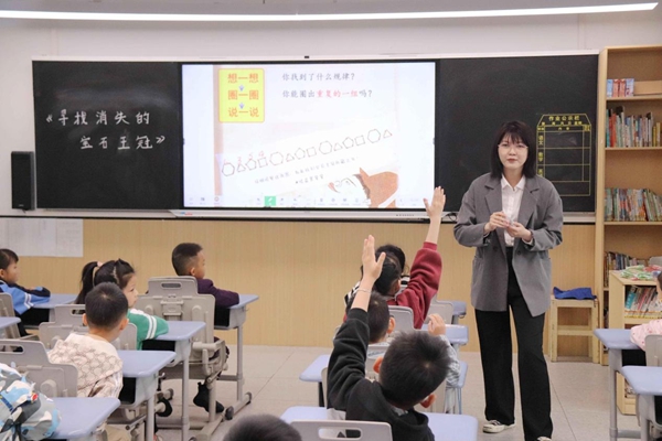 譚瑞芳老師用闖關猜謎語的方式讓孩子們認識一些一年級需要學習的生字,孩子們聚精會神,充分發揮自己的想象力,熟練準確地猜出每一個字謎背后的漢字。