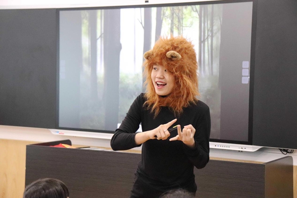 何鳳老師在音樂室中創設了一個森林音樂課堂的情境,并且扮演森林中獅子角色,讓孩子們驚嘆不已。