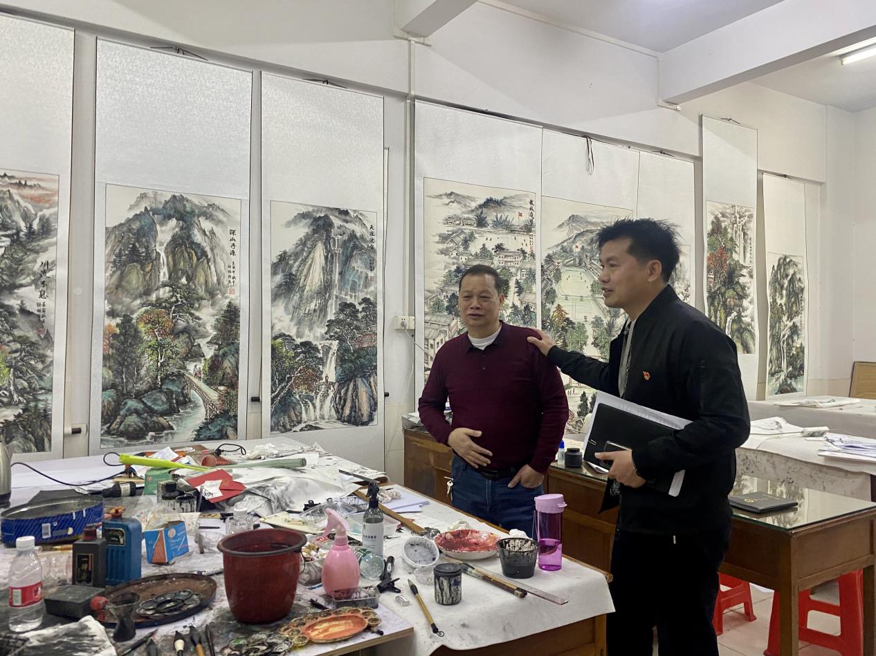 簽約儀式后,雙方召開了校地黨建“共建”座談會,葉書記參觀了我校胡錫強(qiáng)老師國畫工作室,胡老師對自行創(chuàng)作的鄉(xiāng)土作品作了一一介紹。