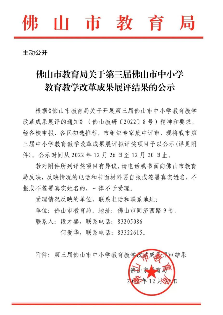 凝心聚力 碩果盈枝 時序更替,華章日新。歲月不居,天道酬勤。回首不平凡的2022年,奮進的泰安人行健不息,在教育科研的路上一直努力攀登,昂首向前! 熱烈祝賀我校在第三屆佛山市中小學教育教學改革成果展評中,由陳燕校長主持的課題成果《唱響音樂之聲 暢想美育筑夢 ——基于核心素養的中小學班級合唱教學研究與實踐》獲得一等獎! 同時,在第38屆佛山市青少年科技創新大賽暨泛家居創意大賽中,我校鐘庭鋒老師獲科技輔導員科技教育創新成果一等獎! 在砥礪奮進的日子里,夢想已經照進現實,科研助力教育教學實踐,教師的科研工作對于教學活動的支撐是一個重要方面,在另一方面,也實現了教學活動對于科研工作的促進,也就是在日常教育實踐之中提出教學重點難點及熱點問題,并對這些問題展開深入的科學研究,為“科研支撐教學”提供更扎實、更充足的資源,并最終形成科研支撐教學、教學促進科研的雙向互動。 展望2023年,全體泰安人勠力同心、銳意進取,與時代同向,與祖國同行!