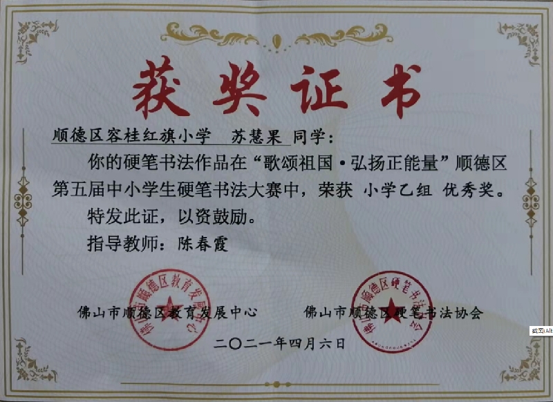 2021年4月榮獲順德區第五屆中小學生硬筆書法大賽小學乙組優秀獎;