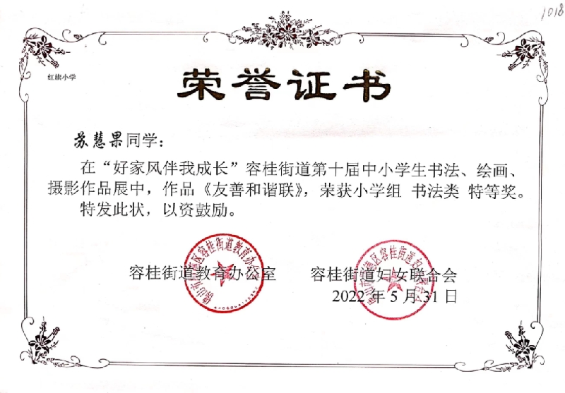 2022年5月榮獲“好家風伴我成長”容桂街道第十屆中小學生書法、繪畫、攝影作品展活小學組書法類特等獎;
