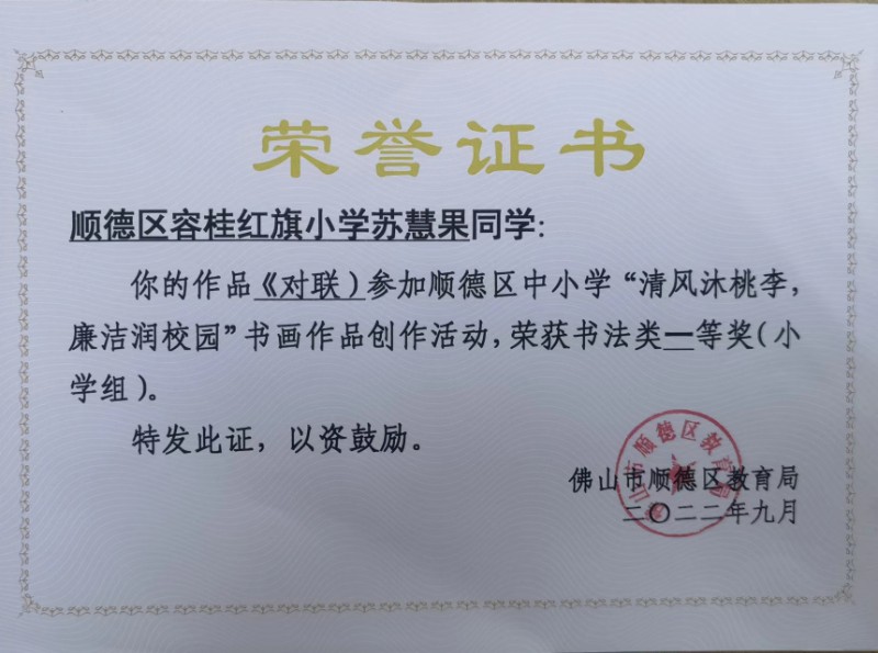 2022年9月榮獲順德區中小學“清風沐桃李,廉潔潤校園”書法作品創作活動小學組書法類一等獎。