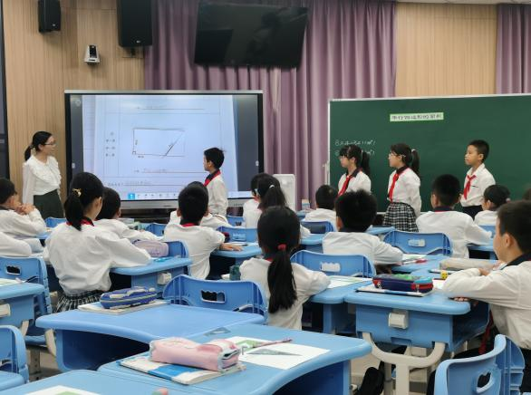 首先,由龍江城區中心小學程佩樺老師帶來五年級上冊《平行四邊形的面積》一課。程老師結合可視化教學的理念,引入與應用可視化技術為學生構造學習環境,及時喚起學生的學習興趣與動力,讓他們易于完成知識建構與能力轉化。本節課利用魚骨圖分析《平行四邊形的面積》的三維目標,為開展可視化教學設計提供基礎。“知識與技能”維度體現在可視化教學技術支持下,通過探究并推理出平行四邊形的面積公式,能正確地應用公式計算平行四邊形的面積。“過程與方法”維度體現在可視化理念支持下,通過動手操作、仔細觀察、活動,自主探索平行四邊形面積計算公式,滲透轉化的數學思想方法。“情感態度與價值觀”體現在培養學生動手探究、應用遷移、合作交流的能力。