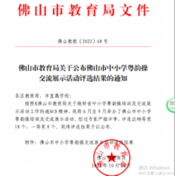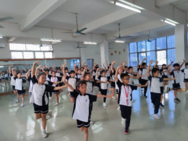 我校粵韻操隊由黃繼紅副校長統籌,在劉藝和李成兩位老師的精心組織下,利用暑假時間、課余時間加急排練,在佛山市中小學校園粵韻操比賽中獲得一等獎的成績。粵韻操是我校的新嘗試,新的突破,既體現了我校少年兒童的藝術素養,又引導少年兒童向真、向善、向美、向上的全面發展。