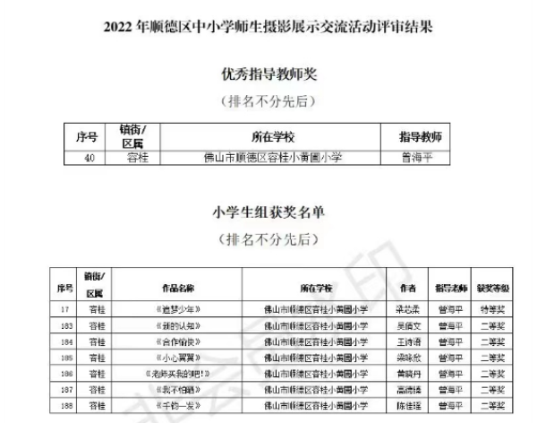 我校攝影隊在曾海平老師的指導下,在2022年順德區中小學師生攝影展示交流活動評審中,獲得1個一等獎,6個二等獎,曾海平老師獲得優秀指導老師稱號。攝影是培養學生發現美的一種途徑,我校攝影隊致力于通過攝影讓學生發現生活中美好的事物,并記錄下來,培養學生的審美能力。