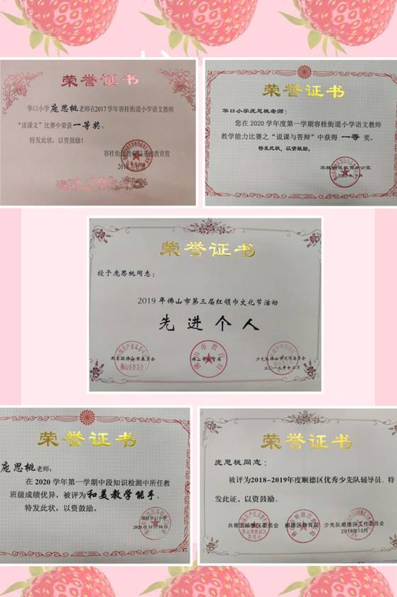 作為一名教育工作者,她深知要教育好學生,教師必須先以身作則,言傳身教,她時刻注意自身的師表形象。她認真學習各種教育教學理論,積極參加各項培訓和比賽努力提高自己的教育教學水平。在教學中,她對學生進行德育滲透。同時,還注意用自己的愛心和關心去教育幫助每一個學生的進步和成長。在對待學生的問題上,不以成績定優劣,對每一位學生都給以應得的關注。 在少先隊工作中,她始終根據學生的年齡特點,通過多渠道、多層面、全方位對隊員進行思想教育,并寓教于活動中,培養從小愛黨敬黨跟黨走的紅孩子。任職期間,她個人在2019年獲評順德區優秀輔導員,所帶中隊的微隊會也多次獲得佛山市和街道的一等獎。