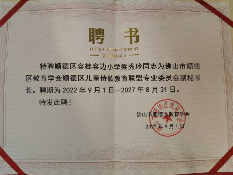 啟動儀式后,順德區(qū)兒童詩歌教育聯(lián)盟召開第一次理事會議。容邊小學(xué)作為第一批“順德區(qū)語言文字推廣基地”及2022-2027年的“順德區(qū)兒童詩歌教育聯(lián)盟成員學(xué)校”獲頒榮譽牌匾。此外,容邊小學(xué)彭海云校長被聘為新一屆順德區(qū)教育學(xué)會兒童詩歌教育聯(lián)盟專業(yè)委員會理事,容邊小學(xué)梁秀玲老師被聘任為順德區(qū)教育學(xué)會順德區(qū)兒童詩歌教育聯(lián)盟專業(yè)委員會副秘書長。