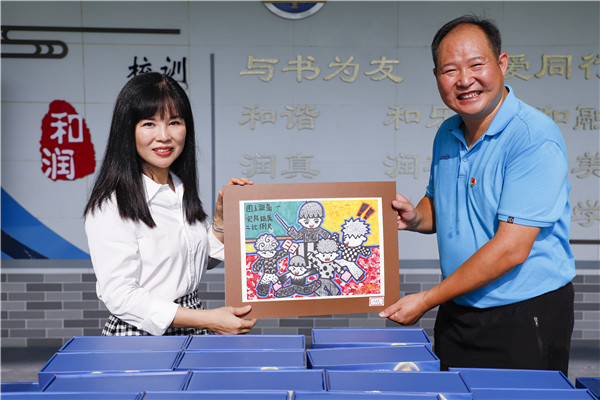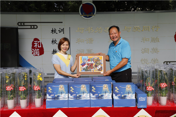 隨后,俞委員代表陳村鎮委鎮政府向教師代表送上鮮花和慰問品,向深耕一線的全體教師致以節日的問候;龍斌校長代表學校向心系教育、關懷一線教師的俞委員和張書記回贈了學生的繪畫作品。