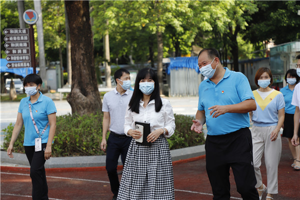 俞飛燕委員一行在龍斌校長等行政的陪同下,來到操場觀看詠春拳演練,學生們洪亮的誦讀聲,整齊劃一、行云流水般的動作展示了中心小學和潤少年應有的自信與風采。隨后,俞委員一行參觀了勞動實踐基地和“嶺南佳果園”,察看了暑假期間升級改造的小型報告廳及心理輔導室,在龍校長的介紹下,了解“和潤教育”的教育理念和學校特色發展的思路,了解“以勞育心”的勞動教育特色,觀賞了校園內多樣的、珍貴的樹木花卉。俞委員對學校優美的校園環境、先進的育人理念,對教師隊伍積極認真、無私奉獻的工作態度,對學生精神抖擻的面貌和自信陽光的氣質,給予了充分的肯定。