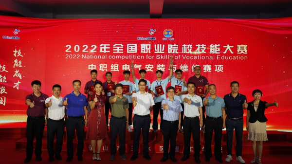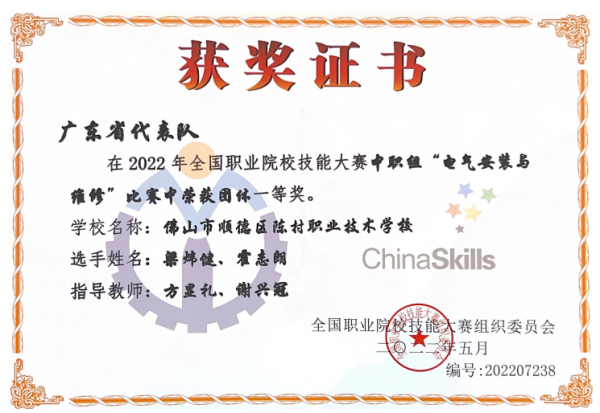 8月22日,2022年全國職業(yè)院校技能大賽(中職組)“電氣安裝與維修”賽項在廣東三水舉行,來自全國各中職學校的63支參賽隊126名選手同臺競技,展開激烈角逐。陳村職業(yè)技術(shù)學校機器人192班梁煒健、霍志朗兩名同學憑借過硬的專業(yè)技能和強大的心理素質(zhì),代表廣東省勇奪該賽項一等獎。指導教師方顯禮、謝興冠被評為“全國優(yōu)秀指導教師”。 這是陳村職校學生時隔9年后再次斬獲全國競賽一等獎。