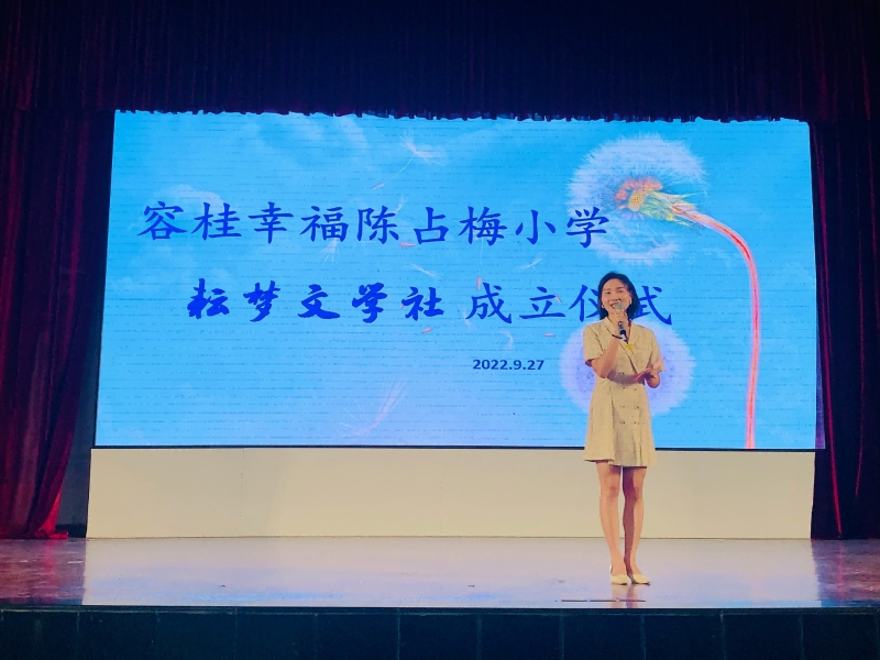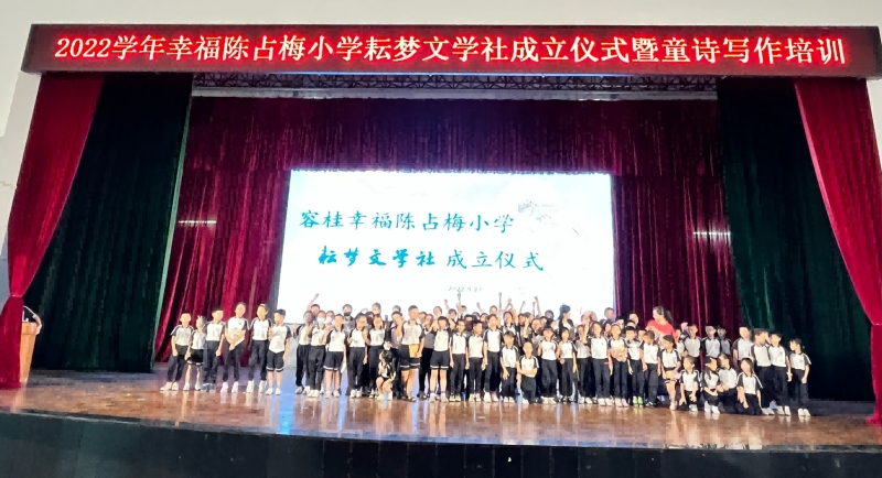 活動伊始,文學顧問團李麗副校長、馬丫老師、文學社正副社長及兩名學生代表共同為文學社揭牌。接著,耘夢文學社社長楊玲老師宣讀《幸福陳占梅小學文學社成立方案》,該社以“幸福讀寫,幸福成長,為童年播下幸福的種子”為宗旨,通過利用延時服務時間開設文學講座、小記者培訓、整本書閱讀讀書會等形式,幫助社員了解更多的文學常識,拓寬知識面,培養他們的文學欣賞能力,激發學生讀書和習作熱情;通過主題征文、校園新聞、現場作文大賽、外出采風等圍繞寫作開展系列活動,提升師生的寫作水平,將優秀作品結集成冊,力爭“耘夢”社團成為校園小作家的孵化器。