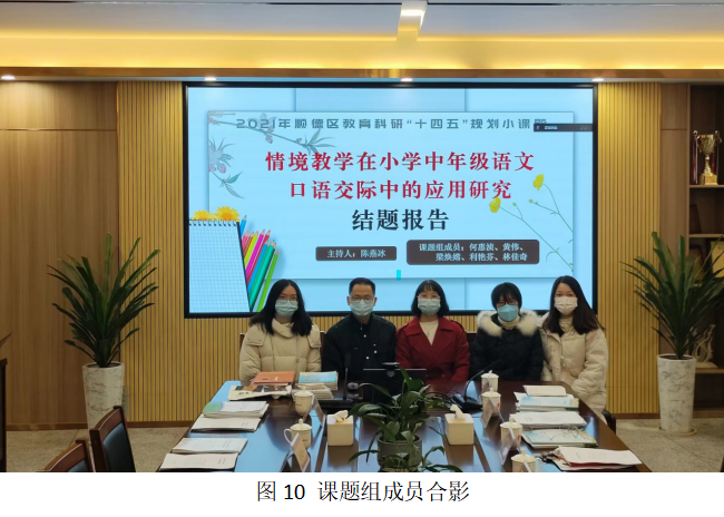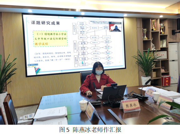 陳燕冰老師主持的《情境教學在小學中年級語文口語交際中的應用研究》進行結題匯報。陳老師重點結合具體課例,闡述情境教學的策略,得到了專家們的肯定。其中,楊倩楨主任認為本課題研究扎實、高效,形成了較為系統的教學流程、策略和評價方式,并建議課題組成員緊扣“大情境”“大任務”,更具創新性地創設多層次的情境,深度提升課題成效。